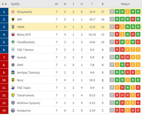 Μόνος πρώτος μετά από 7 αγώνες στην Superleague παραμένει ο Ολυμπιακός, με τους ερυθρόλευκους ύστερα από τη νίκη με 2-1 επί του ΠΑΟΚ, να βρίσκονται στην κορυφή με 17 βαθμούς, με την ΑΕΚ να ακολουθεί στους 16 και τον ΠΑΟΚ να μένει στους 13.
