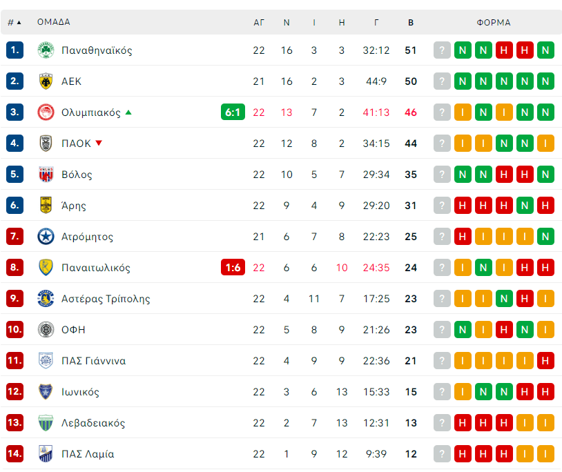 Με τη νίκη του ο Ολυμπιακός επί του Παναιτωλικού (6-1), σε συνδυασμό με την ισοπαλία του ΠΑΟΚ με τον Αστέρα Τρίπολης (2-2), οι ερυθρόλευκοι έμειναν μόνοι τους στην 3η θέση της βαθμολογίας μετά από την 22η αγωνιστική της Superleague.
