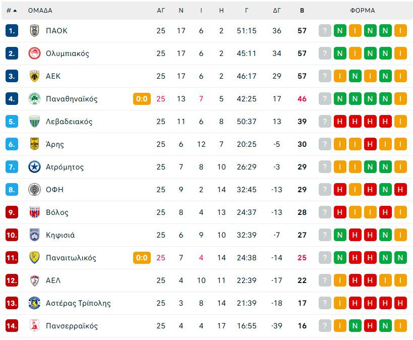 Υστερα από τη νίκη του Ολυμπιακού με 3-0 επί του ΟΦΗ, τη νίκη του ΠΑΟΚ με το ίδιο σκορ επί του Λεβαδειακού, αλλά και την ισοπαλία της ΑΕΚ με 2-2 με τον Ατρόμητο, έχουμε και πάλι ισοβαθμία στην κορυφή της βαθμολογίας με 57 βαθμούς για Ολυμπιακό, ΑΕΚ και ΠΑΟΚ πριν από την τελευταία αγωνιστική της κανονικής περιόδου της Superleague.