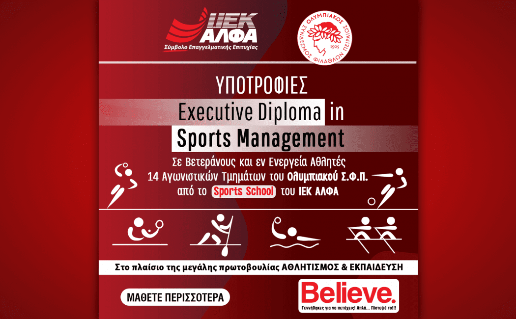 Με στόχο την ανάδειξη και ενίσχυση της μεγάλης πρωτοβουλίας «Αθλητισμός & Εκπαίδευση», που τυγχάνει υποστήριξης από μεγάλες αθλητικές προσωπικότητες και κορυφαίους αθλητικούς φορείς και συλλόγους, μεταξύ των οποίων και ο ΟΛΥΜΠΙΑΚΟΣ, το ΙΕΚ ΑΛΦΑ δημιουργεί τη φετινή ακαδημαϊκή χρονιά το εν λόγω αποκλειστικό τμήμα -από αθλητές/αθλήτριες του Ερασιτέχνη- για το πρόγραμμα «Executive Diploma in Sports Management» του ΑΛΦΑ studies (Κ.Δ.Β.Μ. 2), παρέχοντας πλήρεις υποτροφίες σε εν ενεργεία ή βετεράνους αθλητές -ήτοι 14 υποτροφίες σε 14 αγωνιστικά τμήματα του ΟΛΥΜΠΙΑΚΟΥ Σ.Φ.Π.!