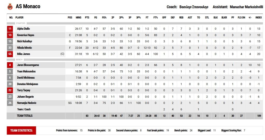Για την Μονακό, ο Μίροτιτς ήταν εξαιρετικός με 20 πόντους και επτά ριμπάουντ και ο Τζέιμς… καθοριστικός, με 19 πόντους, έξι ριμπάουντ και πέντε ασίστ, ανάμεσα τους το τρίποντο της νίκης.