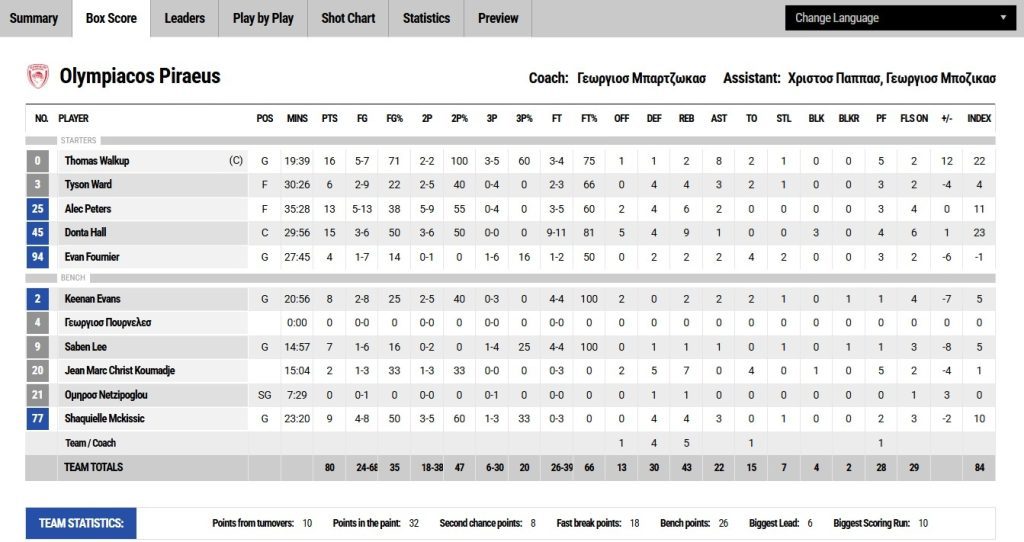 Ο Γουόκαπ, με 16 πόντους και οκτ΄ώ ασίστ, ήταν ο κορυφαίος των Πειραιωτών, με τον Χολ να έχει 15 πόντους και εννιά ριμπάουντ, τον Πίτερς να προσθέτει 13 πόντους και έξι ριμπάουντ, ενώ ο Κίναν Έβανς είχε οκτ΄ώ πόντους σε κάτι παραπάνω από 20′.