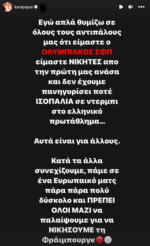 Ο Κώστας Καραπαπάς με ανάρτησή του στο Instagram καθιστά σαφές πως το 1-1 του Ολυμπιακού με την ΑΕΚ στην Opap Arena δεν αφήνει ικανοποιημένο κανέναν στην ομάδα.