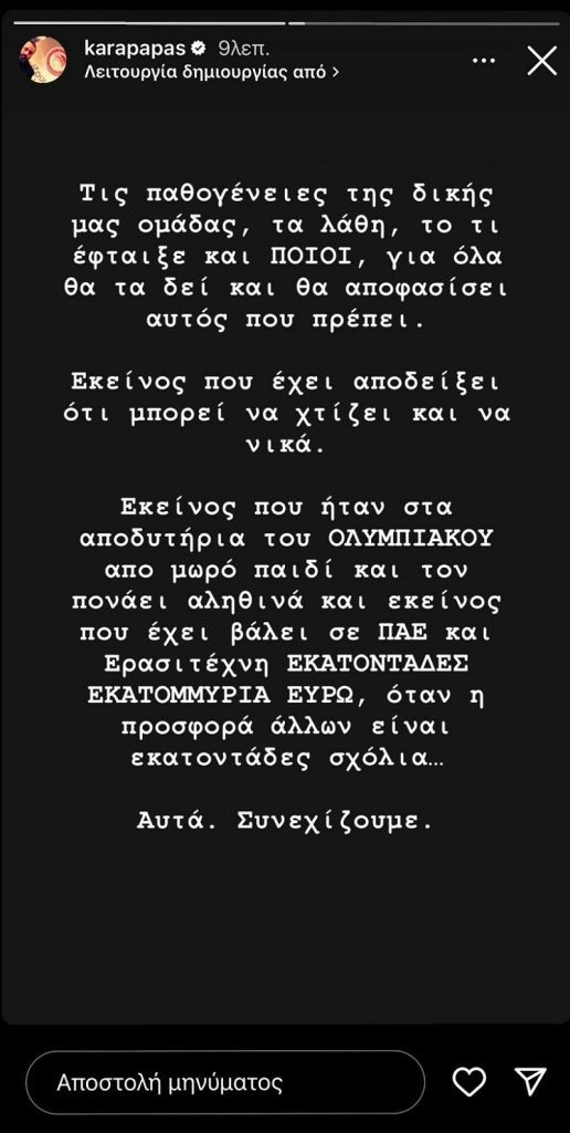 «Τις παθογένειες της δικής μας ομάδας, τα λάθη, το τι έφταιξε και ποιοι, για όλα θα τα δει και θα αποφασίσει αυτός που πρέπει. Εκείνος που έχει αποδείξει ότι μπορεί να χτίζει και να νικά.