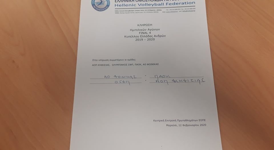 Η Κηφισιά θα είναι η αντίπαλος του Ολυμπιακού στο Final 4 του Κυπέλλου Ελλάδας, όπως προέκυψε από την κλήρωση που πραγματοποιήθηκε το μεσημέρι της Τετάρτης (12/2) στα γραφεία της Ε.Ο.ΠΕ.
