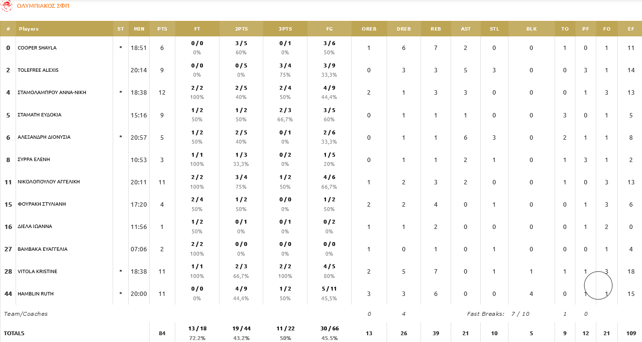 Η Σταμολάμπρου, με 12 πόντους, ήταν η πρώτη σκόρερ για τον Ολυμπιακό, με τις Νικολοπούλου, Βίτολα και Χάμπλιν, να ακολουθούν με 11.