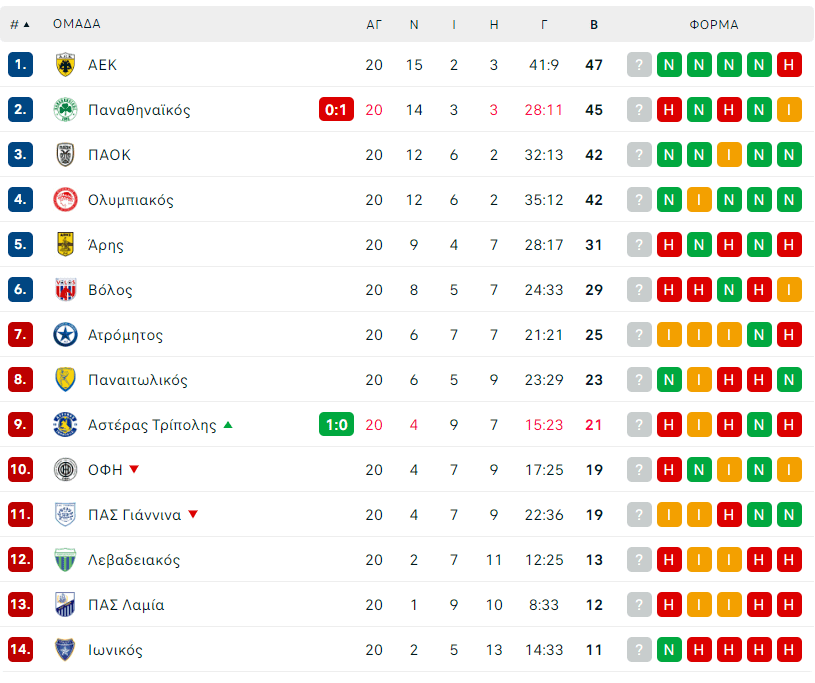 Έτσι πλέον η ΑΕΚ είναι πρώτη με 47 βαθμούς, με τον Ολυμπιακό να βρίσκεται μόλις πέντε βαθμούς πίσω.
