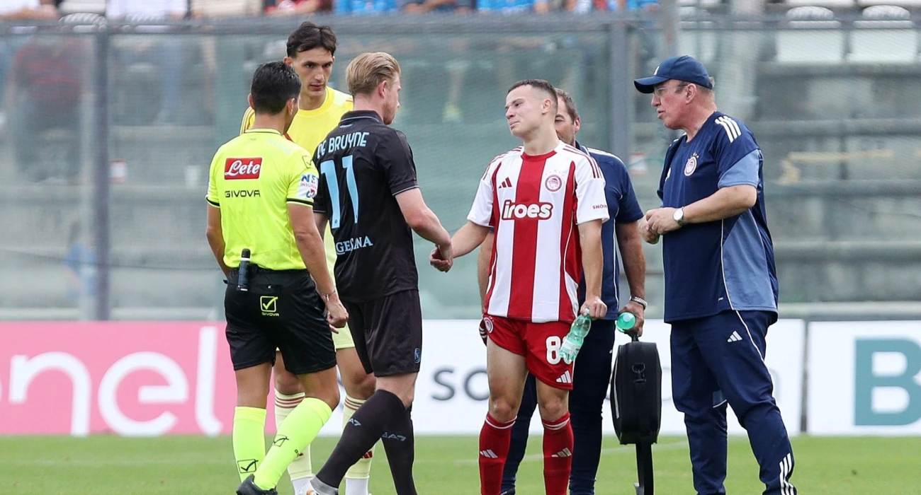 Κατά τη διάρκεια του πρώτου ημιχρόνου στο Καστέλ Ντι Σάνγκρο, το προπονητικό κέντρο της Νάπολι, ο Κέβιν Ντε Μπρόινε έκανε ένα σκληρό μαρκάρισμα στον Σταύρο Πνευμονίδη.