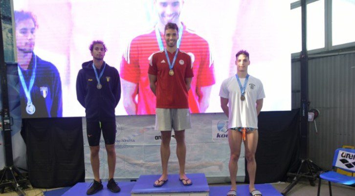 Νωρίτερα, ο πρωταθλητής Ευρώπης επικράτησε για ένατη διαδοχική χρονιά στα 50μ. ύπτιο (11η συνολικά), και μάλιστα με το εξαιρετικό 24.91, και με το τρίτο χρυσό του στη διοργάνωση «έγραψε ιστορία», καθώς έφτασε τους 33 ατομικούς τίτλους σε Πανελλήνια Πρωταθλήματα και ισοφάρισε τον θρυλικό Σπύρο Γιαννιώτη, με τον οποίο μοιράζονται (προφανώς μέχρι του χρόνου) την πρώτη θέση στη λίστα με τους πολυνίκες του θεσμού στους άνδρες. Το απόλυτο ρεκόρ διατηρεί η Μαριάννα Λυμπερτά, με 37 νίκες. Στη δεύτερη θέση τερμάτισε ο Βαγγέλης Μακρυγιάννης με 25.22 και στην τρίτη ο Θόδωρος Ανδρεόπουλος με 25.63.