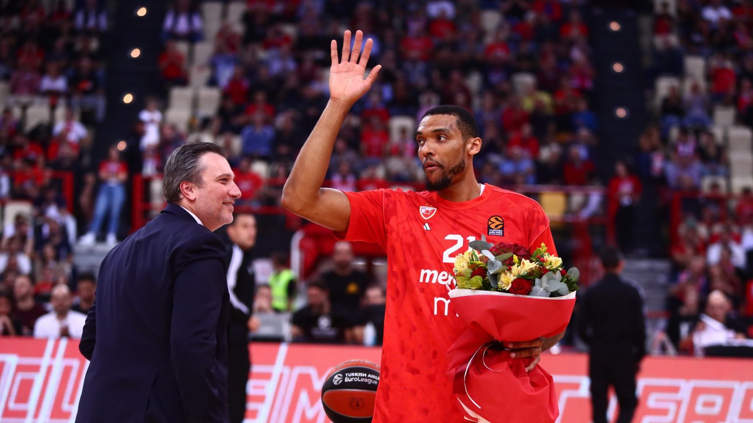 Έτσι ο Ολυμπιακός δεν έχασε την ευκαιρία να τιμήσει τον πρώην παίκτη του, με τον GM της ομάδας του Πειραιά, Νίκο Λεπενιώτη, να του δίνει ανθοδέσμη.