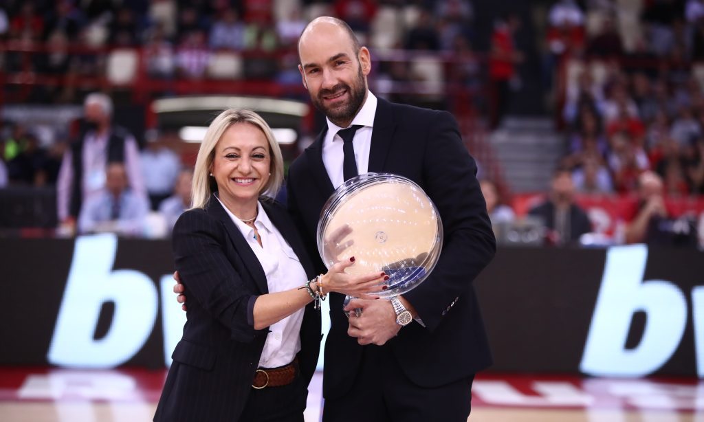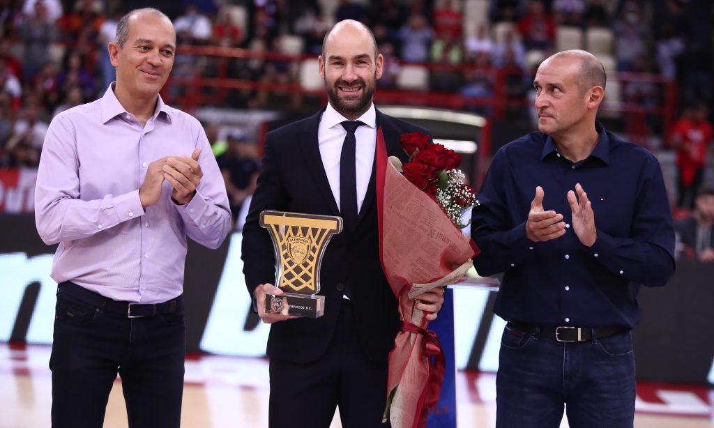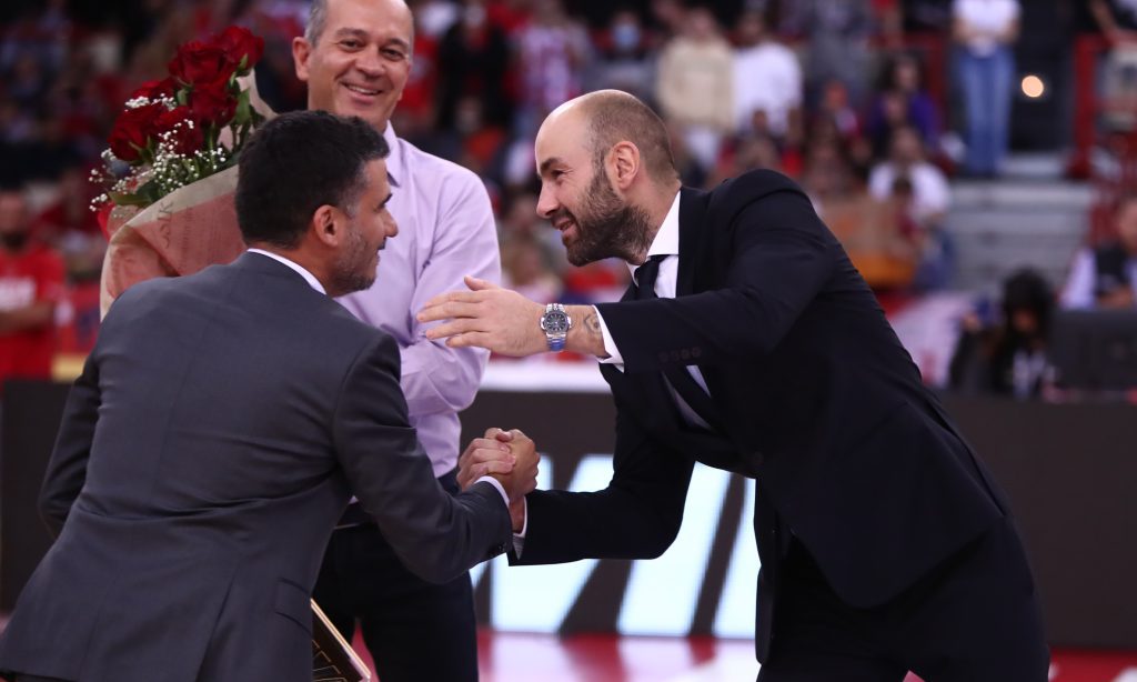 Ο Βασίλης Σπανούλης επέστρεψε στο… σπίτι του, αυτή τη φορά ως προπονητής του Περιστερίου, με τους Παναγιώτη και Γιώργο Αγγελόπουλο να βραβεύουν τον Kill Bill για την τεράστια προσφορά του στον Ολυμπιακό.