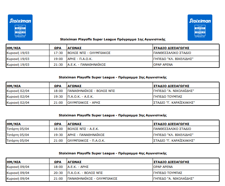 Ορίστηκαν οι ημέρες και οι ώρες των αγώνων των πλέι οφ για τις 4 πρώτες αγωνιστικές. Ο Ολυμπιακός αυτή την Κυριακή στις 5.30 θα αντιμετωπίσει εκτός έδρας τον Βόλο, για την πρώτη αγωνιστική.