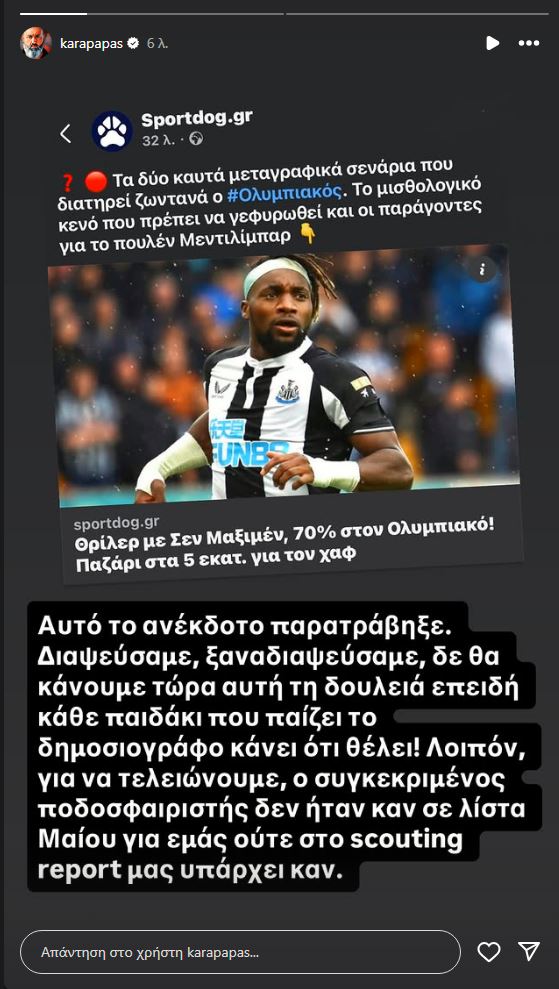 Αυτή δεν είναι η πρώτη φορά που ο Ολυμπιακός διαψεύδει για τον συγκεκριμένο παίκτη, αφού κάτι ανάλογο είχε συμβεί και πριν από λίγες ημέρες. Όμως, τα νέα δημοσιεύματα έφεραν την ανάρτηση του Κώστα Καραπαπά, με τον αντιπρόεδρο της πειραϊκής ΠΑΕ να ξεκαθαρίζει με τον πλέον εμφατικό τρόπο ότι οι Πειραιώτες δεν έχουν στη λίστα τους τον Σεν Μαξιμέν.