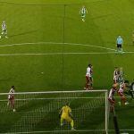 Στο 40’ τεράστια ευκαιρία για τον Ολυμπιακό όταν μετά από σέντρα του Φορτούνη, ο Μασούρας έκανε την κεφαλιά, πάνω στον Μπρινιόλι.