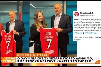 Ο Ολυμπιακός συνεχάρη Γιώργο Λάνθιμο, Έμα Στόουν και τους κάλεσε στο γήπεδο