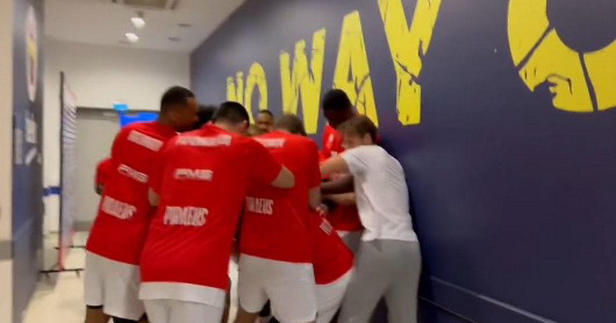 Έτσι, πριν την είσοδο της ομάδας στο παρκέ, ο Σάσα Βεζένκοβ έκανε το καθιερωμένο… ντου στον Γιαννούλη Λαρεντζάκη, με τα μάτια των «ερυθρόλευκων» να… λάμπουν.