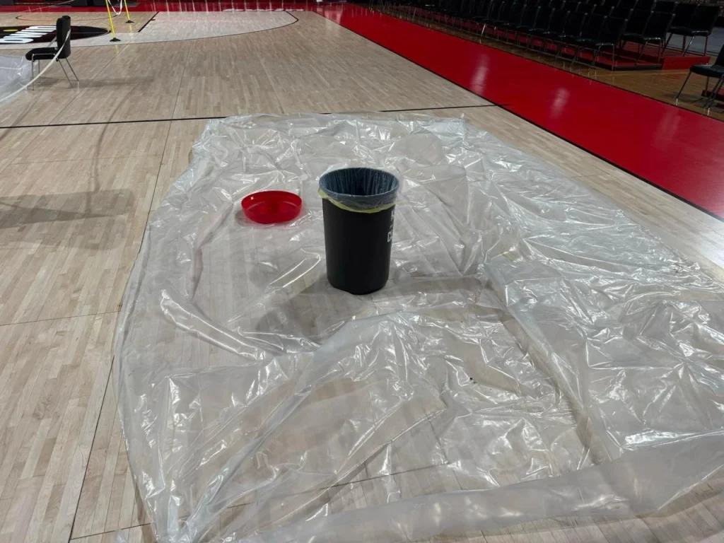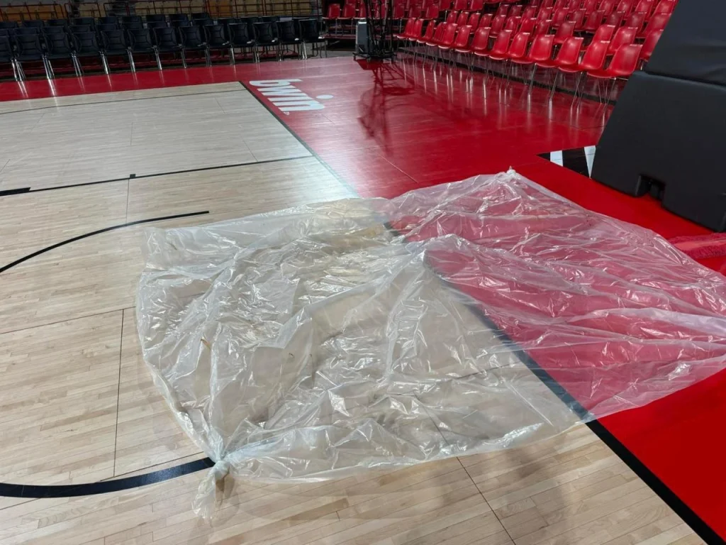 Οι άνθρωποι της ομάδας έχουν τοποθετήσει ένα ειδικό στρώμα αλλά και σακούλες στο παρκέ προκειμένου να αποφύγουν τα χειρότερα. Είναι γνωστό ότι το ΣΕΦ αντιμετωπίζει πολύ συχνά τέτοια προβλήματα εξαιτίας των κακοκαιριών που πλήττουν τόσο το γήπεδο γενικά, όσο και το παρκέ.