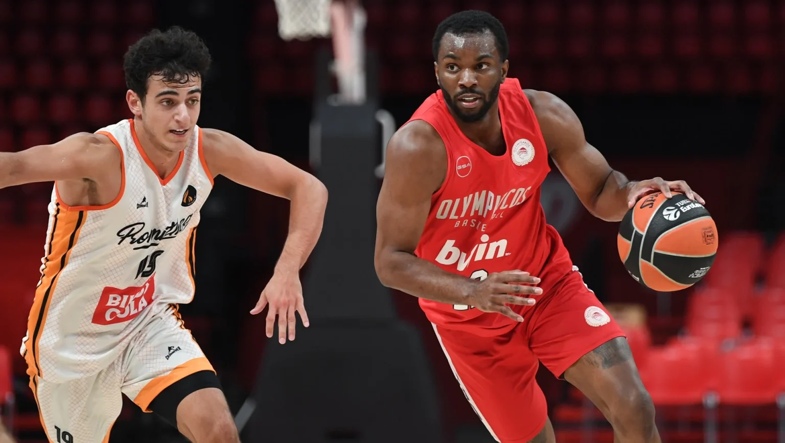 Μετά τα πρώτα τρία λεπτά του αγώνα, όπου ο Προμηθέας με πολύ πιεστική άμυνα πήρε προβάδισμα (3-7, 2′), ο Ολυμπιακός «απάντησε» με 13-0 και προσπέρασε 16-7 (5′). Ο Κίναν Έβανς «τάισε» τον Ντόντα Χολ σε δύο περιπτώσεις με τον Αμερικανό σέντερ να φτάνει σε καλάθι και φάουλ, ενώ ο Σάσα Βεζένκοφ βρήκε επαφή με το καλάθι, πετυχαίνοντας επτά σερί «ερυθρόλευκους» πόντους. Λάθη, έφεραν κακό αμυντικό τρανζίσιον και έδωσαν την ευκαιρία στους φιλοξενούμενους να πλησιάσουν (21-17, 8′), με την περίοδο να κλείνει στο 25-21 και τον Καλίφα Κουμάντζε να προσφέρει και στις δύο πλευρές του παρκέ.