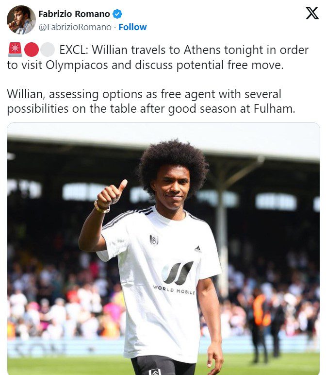 Προχωράει ο Ολυμπιακός για την απόκτηση του Βραζιλιάνου μεσοεπιθετικού Γουίλιαν, ο οποίος σύμφωνα με τον έγκριτο δημοσιογράφο Φαμπρίτζιο Ρομάνο, αναμένεται στην Αθήνα για να μιλήσει με τους ερυθρόλευκους.