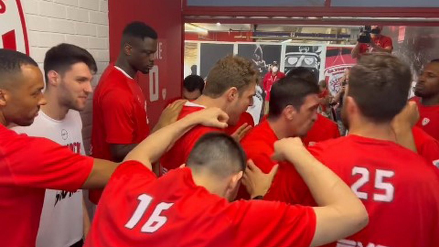 Όπως (σχεδόν) σε κάθε “ερυθρόλευκο” τελετουργικό, πριν την είσοδο των παικτών του Ολυμπιακού στο παρκέ, ο Σάσα Βεζένκοβ ΄δίνει το σύνθημα και οι υπόλοιποι την… πέφτουν στον Γιαννούλη Λαρεντζάκη, κάτι που συνέβη πριν την έναρξη και του 3ου τελικού της Basket League απέναντι στον Παναθηναϊκό.