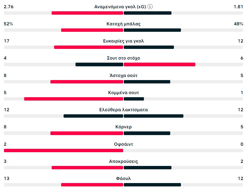 Η ομάδα του Ντιέγκο Μαρτίνεθ δημιούργησε και είχε 17 τελικές προσπάθειες, με 8 κερδισμένα κόρνερ. Όμως μόλις 4 σουτ βρήκαν τον στόχο, κάτι που χαρακτηρίζει την αστοχία των πειραιωτών.
