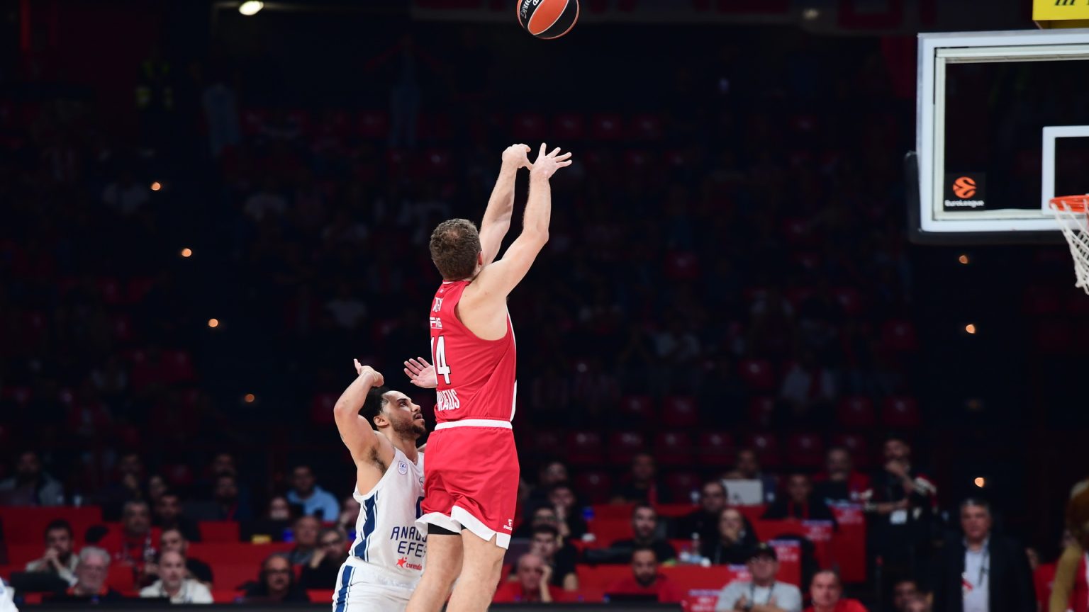 Εξαιρετικό το ξεκίνημα των Πειραιωτών στο ματς, καθώς ένα γκολ – φάουλ του Βεζένκοβ και ένα τρίποντο του Ντόρσεϊ, έφεραν το γρήγορο 6-0, ενώ το δεύτερο σερί τρίποντο του ομογενή γκαρντ, για το 9-2, ανάγκασε τον Κοκόσκοβ σε άμεσο τάιμ άουτ. Ο Ντόρσεϊ συνέχισε σε… δαιμονισμένο ρυθμό και με συνεχόμενους πόντους έγραψε το 14-5, όμως οι Τούρκοι απάντησαν με ένα γρήγορο 8-0 για το 14-13. Ο Λάρκιν με λέι απ ανέβασε το σερί της Εφές στο 0-10, με τους Τούρκους να περνάνε για πρώτη φορά μπροστά στο σκορ με 15-14. Μάλιστα, ακόμα δύο τρίποντα, από τους Οσμάνι και Λάρκιν, έφεραν το σκορ στο 16-21, με την Αναντολού να τρέχει ένα επιμέρους 19-4 από το 12-2 και μετά και τον Μπαρτζώκα να καλεί εσπευσμένα σε τάιμ άουτ. Οι «ερυθρόλευκοι» επέστρεψαν στο παρκέ με δύο τρίποντα του Πίτερς για το 22-23, με το πρώτο δεκάλεπτο να ολοκληρώνεται με την Εφές μπροστά με 28-25 και τους Πειραιώτες να έχουν ήδη κάνει έξι φάουλ.