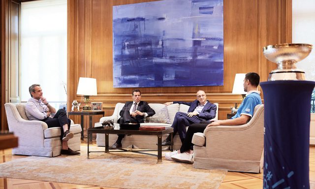 Με τον πρόεδρο της ΕΟΚ, Βαγγέλη Λιόλιο, τον ομοσπονδιακό προπονητή Δημήτρη Ιτούδη και τον διεθνή φόργουορντ Κώστα Παπανικολάου, συναντήθηκε στο Μέγαρο Μαξίμου ο Πρωθυπουργός Κυριάκος Μητσοτάκης, το πρωί της Τρίτης (26/7).
