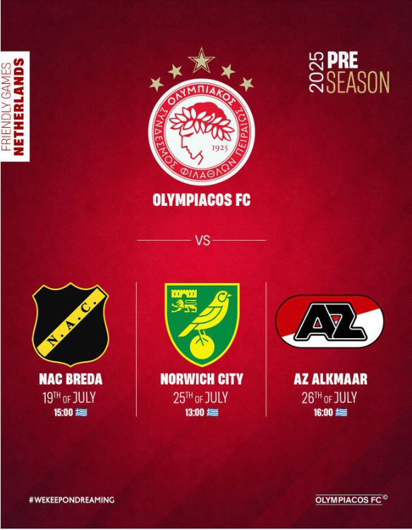 Οι Πειραιώτες θα αγωνιστούν στις 19/7 απέναντι στην Μπρέντα στις 15:00, ενώ στις 25/7 θα αντιμετωπίσουν τη Νόριτς στις 13:00 και μία μέρα μετά κόντρα στην Άλκμααρ στις 16:00.