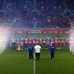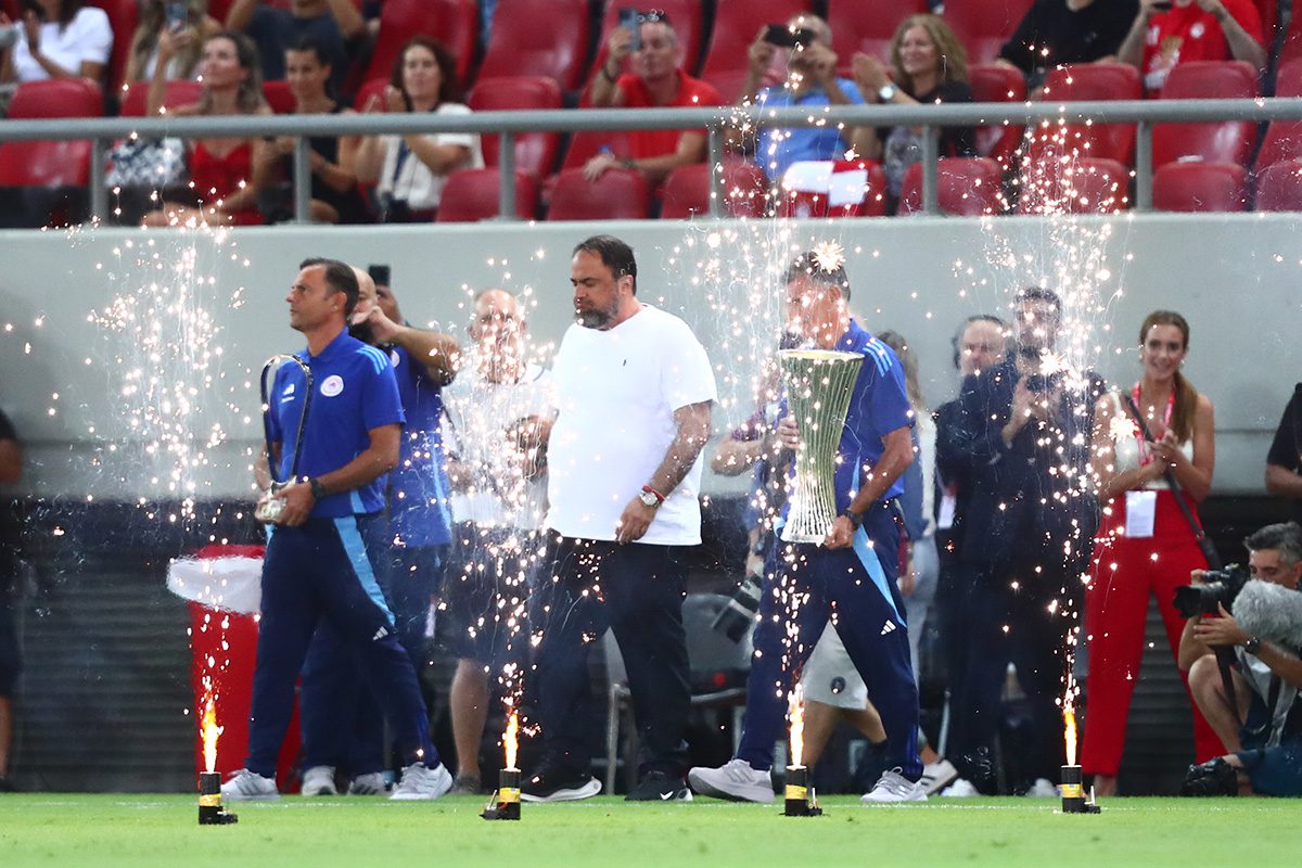 Τα ευρωπαϊκά τρόπαια του Ολυμπιακού βρέθηκαν στο Στάδιο Καραϊσκάκη, με τον πρόεδρο του Ολυμπιακού, Βαγγέλη Μαρινάκη, να παίρνει τον λόγο και να απευθείνεται προς τον κόσμο λέγοντας: