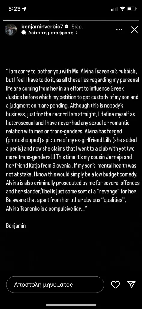 «Ζητώ συγγνώμη που σας ενοχλώ με την Αλβίνα Τσαρένκο, αλλά νιώθω πως πρέπει να το κάνω, καθώς όλα αυτά τα ψέματα που αναφέρει σχετικά με την προσωπική μου ζωή, έρχονται από αυτήν σαν μια προσπάθεια για να επηρεάσει την ελληνική δικαιοσύνη, μιας και εκκρεμεί η δικαστική απόφαση σχετικά με το παιδί.