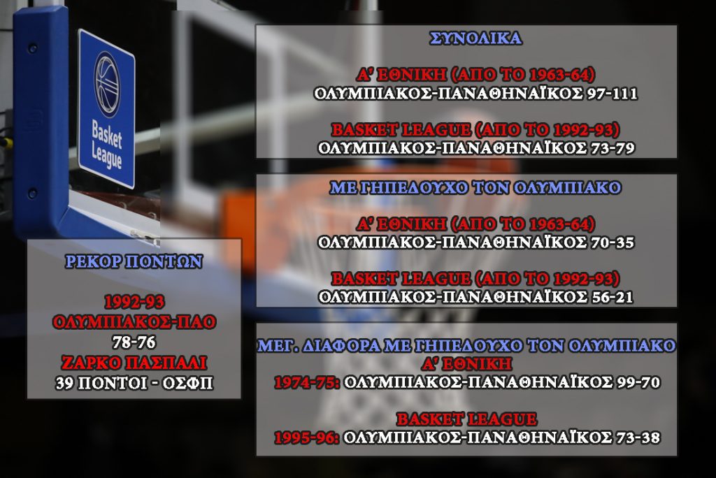 Ολυμπιακός-Παναθηναϊκός, αγώνας Νο 209 από καταβολής Α’ Εθνικής, θα είναι αυτός που θα γίνει αύριο στο ΣΕΦ. Στην ιστορία που άρχισε να γράφεται από την περίοδο 1963-64, ο Παναθηναϊκός έχει το προβάδισμα κάτι που ισχύει και ειδικότερα στα χρόνια του επαγγελματικού Πρωταθλήματος με τη διαφορά ωστόσο να είναι μικρότερη.