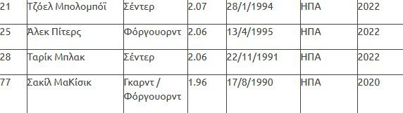 Έμειναν, επίσης, οι Σακίλ ΜαΚίσικ, Τόμας Γουόκαπ, Μουσταφά Φαλ και αποκτήθηκαν ο έμπειρος και προερχόμενος από την Ούνιξ Καζάν Αϊζάια Κάνααν στην θέση του Τάιλερ Ντόρσεϊ, ο Άλεκ Πίτερς από την Μπασκόνια στην θέση του Πρίντεζη, ο σέντερ Τζόελ Μπολομπόϊ από την ΤΣΣΚΑ, ο, επίσης, σέντερ Ταρίκ Μπλακ, που έχει εμπειρία από την Ευρωλίγκα με τα χρώματα των Μακάμπι Τελ Αβίβ, Ζενίτ και ο προερχόμενος από το NCAA Τζόρτζ Πάπας.