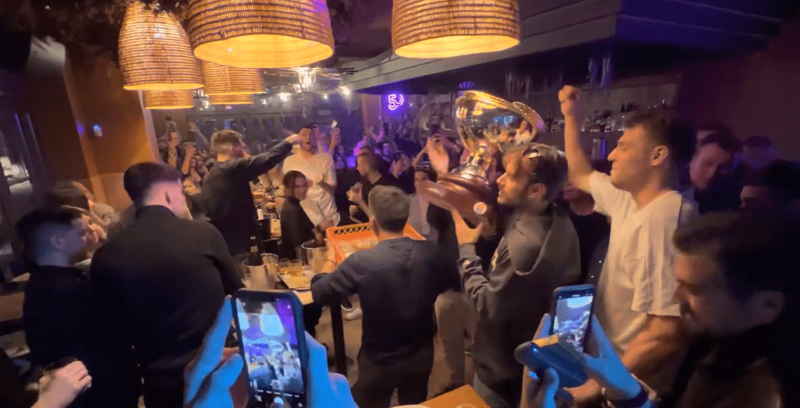 Στιγμές χαράς για τους παίκτες του Ολυμπιακού μετά από την κατάκτηση του κυπέλλου Ελλάδος. Όλοι μαζί μετά από την απονομή του 11ου κυπέλλου για τον Θρύλο, πήγαν σε νυχτερινό μαγαζί του Ηρακλείου για να διακεδάσουν την επιτυχία τους.