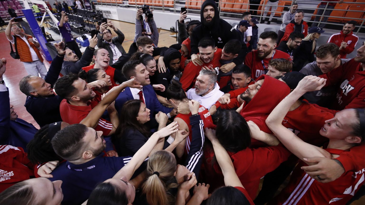 Έτσι, μετά το φινάλε του ημιτελικού – θρίλερ, άνδρες και γυναίκες των «ερυθρόλευκων» έγιναν… ένα, κάνοντας μαζί το «ζντο» της νίκης.