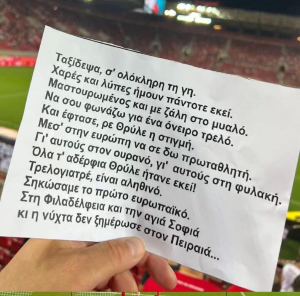 ΠΑΡΑΣΚΗΝΙΑ Το νέο σύνθημα: «Τρελογιατρέ είναι αληθινό, σηκώσαμε το πρώτο ευρωπαϊκό» (video) Last updated: 11/08/2024 5:38 ΜΜ REDNEWS Team Published: 11/08/2024 Κοινοποίηση ΦΙΛΙΚΟΣ ΑΓΩΝΑΣ / ΟΛΥΜΠΙΑΚΟΣ - ΝΟΤΙΓΧΑΜ ΦΟΡΕΣΤ (ΜΑΡΙΛΙΑ ΒΑΣΙΛΑΚΟΠΟΥΛΟΥ / EUROKINISSI) Κοινοποίηση Νέο Σύνθημα Θύρα 7: «Τρελογιατρέ είναι αληθινό, σηκώσαμε το πρώτο ευρωπαϊκό» Μόρις αντί Έβανς στην λίστα της GBL Πρόκριση-θρίλερ με υπογραφή Γούλφολκ Φουρνιέ: «Θα γίνουμε καλύτεροι πολύ σύντομα» Τι ζήτησε ο Μεντιλίμπαρ από τον Αγιο Βασίλη Ολυμπιακός | Έδειξε δίψα για να κάνει ένα ακόμα ντάμπλ με 6 διαφορετικούς σκόρερ κόντρα στον Ηρακλή TAGGED:top VIDEO Κοινοποίηση άρθρου Facebook Whatsapp Whatsapp Copy Link ByREDNEWS TeamΑκολουθήστε:Είσαι στο μυαλό κάτι μαγικό όπου πας εσύ πάντα θα μαι εγώ να σου τραγουδώ Θρύλε ολέ, ολέ, Θρύλε ολέ, ολέ... Επομενο θεμα Νέα δυναμική με Βέλντε και Ζέλσον στα “φτερά” Προηγουμενο θεμα Απολύθηκε ο προπονητής της Μπράγκα και πάει ο Καρβαλιάλ! Τι θα γίνει με Ορτα Rednews Youtube Ροή Ειδήσεων Σε… χριστουγεννιάτικη διάθεση το ΣΕΦ στο ματς με την Βιλερμπάν OLYMPIACOS BC 19/12/2025 Μπαρτζώκας: «Να διαχειριστούμε τα συναισθήματα μας» OLYMPIACOS BC 18/12/2025 Εκτός με Βιλερμπάν ο Μόρις, με Κολοσσό το ντεμπούτο του Αμερικανού γκαρντ OLYMPIACOS BC 18/12/2025 Νικηφόρο πέρασμα από την Σαντορίνη ΒΟΛΕΪ ΓΥΝΑΙΚΕΣ 18/12/2025 Επιστροφή στις νίκες, 3-2 τον Φλοίσβο ΒΟΛΕΪ ΑΝΔΡΕΣ 18/12/2025 Εξάρα ο Θρύλος στον Ηρακλή ΠΟΔΟΣΦΑΙΡΟ 17/12/2025