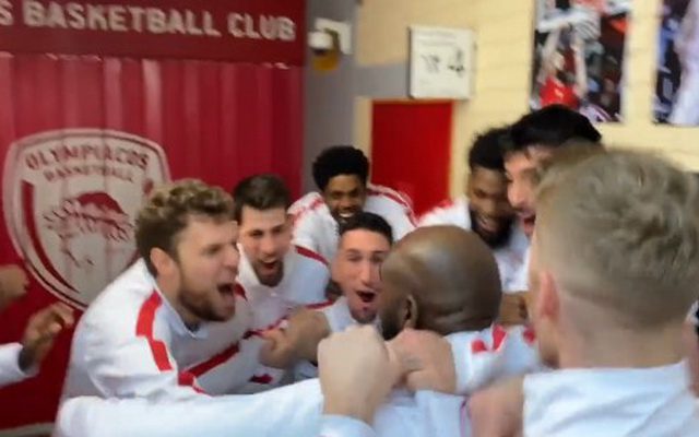 Ο Γιώργος Πρίντεζης τήρησε τις… παραδόσεις, πριν την είσοδο της ομάδας στο παρκέ, με τον Κουίνσι Έισι να πέφτει… θύμα του αρχηγού του Ολυμπιακού!