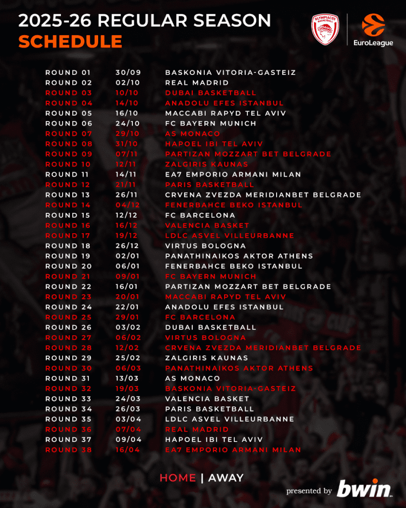 Η Ευρωλίγκα ανακοίνωσε σήμερα (17/07) το πρόγραμμα της κανονικής περιόδου για τη σεζόν 2025-2026.