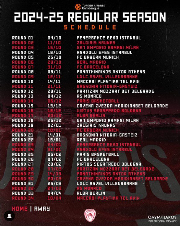 Η EuroLeague έδωσε στη δημοσιότητα το πρόγραμμα της αγωνιστικής περιόδου 2024-25. Το ντέρμπι αιωνίων θα είναι την 8η αγωνιστική στο ΟΑΚΑ στις 8 Νοεμβρίου (21:15), ενώ το δεύτερο στις 14 Μαρτίου με γηπεδούχο τον Ολυμπιακό (21:15) για την 29η αγωνιστική.