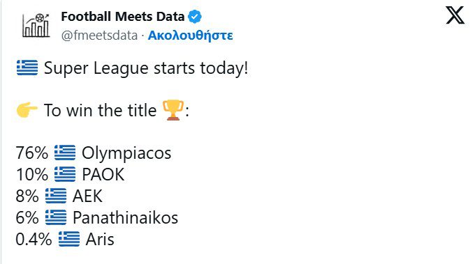 Η γνωστή σελίδα Football Meets Data, υπολόγισε τις πιθανότητες κάθε διεκδικήτριας του τίτλου, για την κατάκτηση της Super League. Όπως και οι στοιχηματικές εταιρίες, η εν λόγω ιστοσελίδα, θεωρεί μεγάλο φαβορί τον Ολυμπιακό, στον οποίο δίνει 76% να στεφθεί πρωταθλητής.